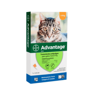 $12.000Advantage庐聽gatos聽es un antiparasitario聽externo, de acci贸n t贸pica, indicado en el tratamiento y control de infestaciones de pulgas en gatos. Despu茅s de la aplicaci贸n, la grasa natural del pelaje y los movimientos del animal distribuyen la dosis sobre toda la superficie corporal, eliminando el 100% de las pulgas durante las primeras 12 horas.聽Con su acci贸n residual, protege al gato contra nuevas infestaciones de pulgas durante cuatro semanas. Indicado聽para gatos de 8 semanas o m谩s.