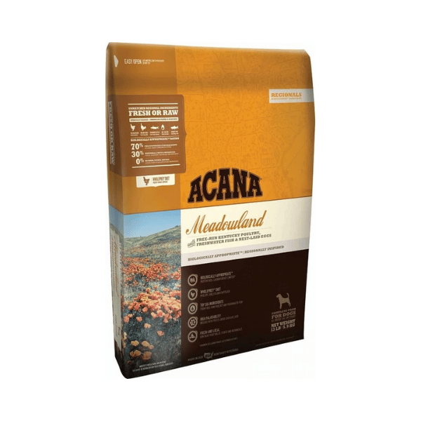 ACANA Meadowland contiene pollo Cobb de corral, pavo Tom, huevos del nido, bagre azul y trucha arcoíris, frescos y en proporciones de presaentera, semejando la dieta evolutiva. Preparado en las cocinas DogStar con los mejores y más frescos ingredientes garantizando mantener a tu perro saludable, feliz y fuerte.