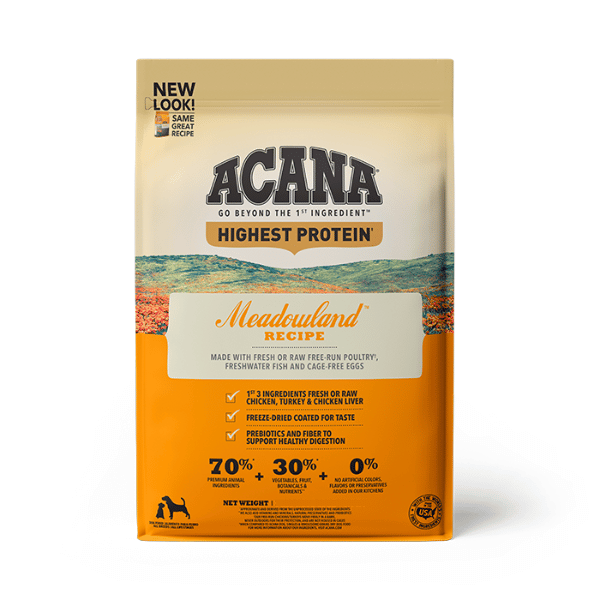 ACANA Meadowland contiene pollo Cobb de corral, pavo Tom, huevos del nido, bagre azul y trucha arcoíris, frescos y en proporciones de presaentera, semejando la dieta evolutiva. Preparado en las cocinas DogStar con los mejores y más frescos ingredientes garantizando mantener a tu perro saludable, feliz y fuerte.