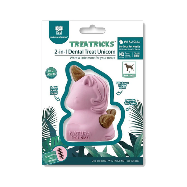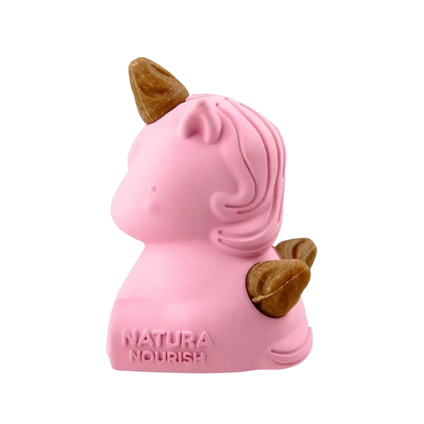 Juguete dental con forma de unicornio, sabor a pollo. Dise帽ado para limpiar los dientes y masajear las enc铆as, promoviendo la salud bucal mientras el perro se divierte.