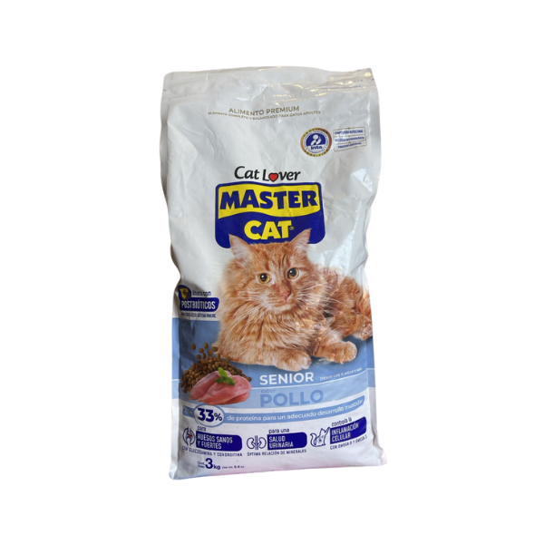 Alimento seco completo y balanceado para gatos mayores de 7 a帽os. MASTER CAT Pollo Senior est谩 formulado con prote铆nas de alta calidad, bajo en sodio y con nutrientes esenciales que ayudan a mantener la salud renal, articular y digestiva de tu gato senior. Presentaci贸n de 3 kg.