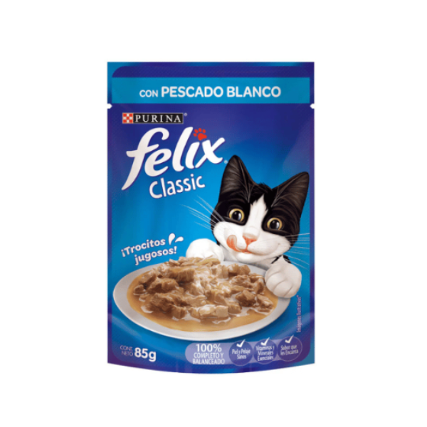 Exquisito alimento h煤medo para gatos, elaborado con trozos de pescado blanco en una sabrosa salsa. Ofrece una nutrici贸n completa y equilibrada, ideal para gatos exigentes. Pr谩ctico formato individual de 85g.