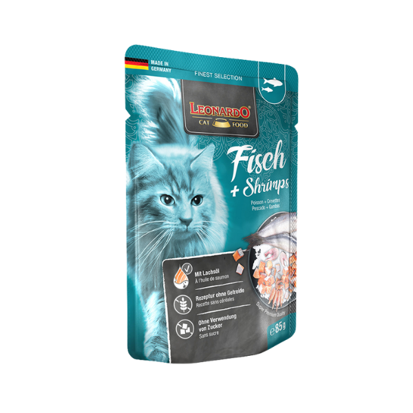 Leonardo Pouch Pescado y Camarones ofrece una excelente opci贸n en pr谩cticas raciones individuales. Se caracterizan por su jugosa carne, realzada con delicados ingredientes y cocinada cuidadosamente en bolsas individuales. Adem谩s, el aceite de salm贸n incluido en la receta aporta 谩cidos grasos poliinsaturados beneficiosos para la salud de las mascotas.
