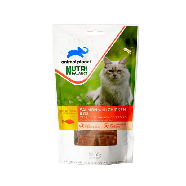 Animal Planet Nutribalance, Snack gato hecho con proteína de origen animal, sin colorantes añadidos y con mayor digestibilidad, que le permite al perro y al gato absorber mejor los nutrientes del producto.